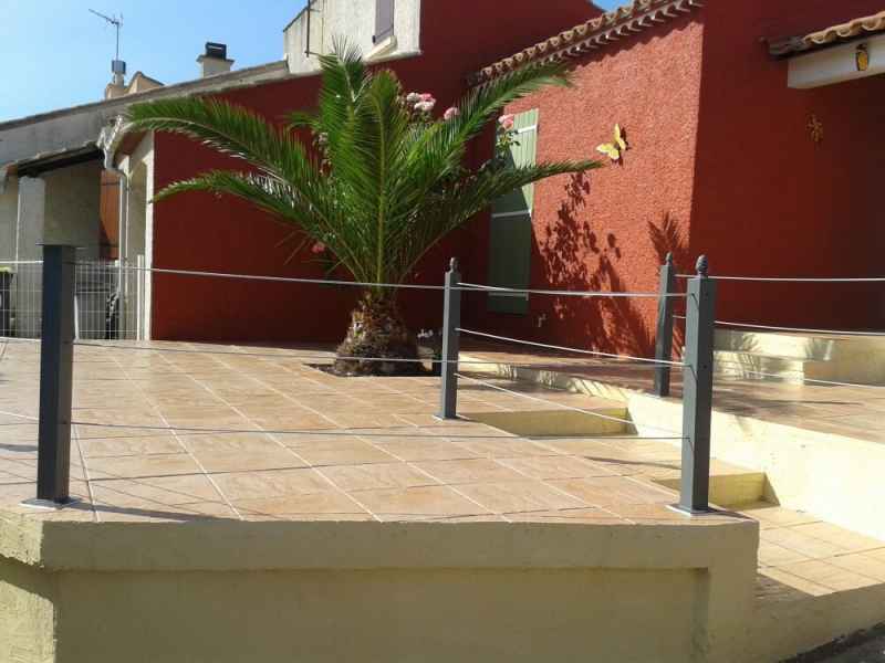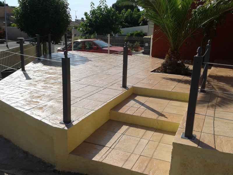 Création d'une terrasse en béton armé sur 2 niveaux avec escalier. Dallage collé et traitement anti taches. Poteaux et filins sur mesures.