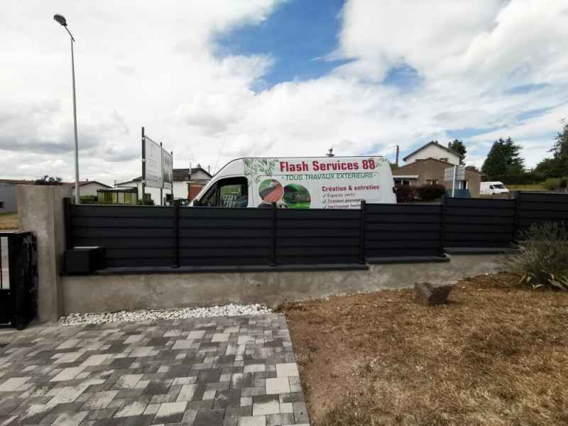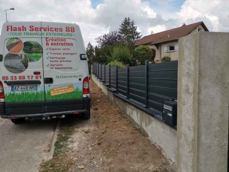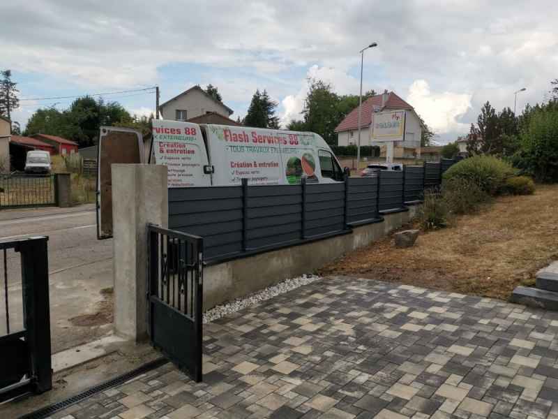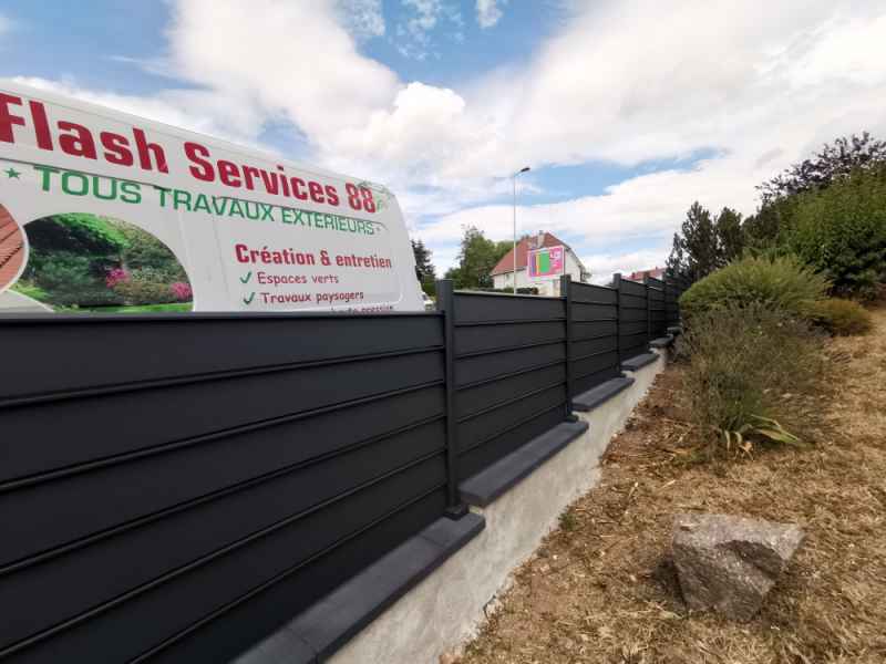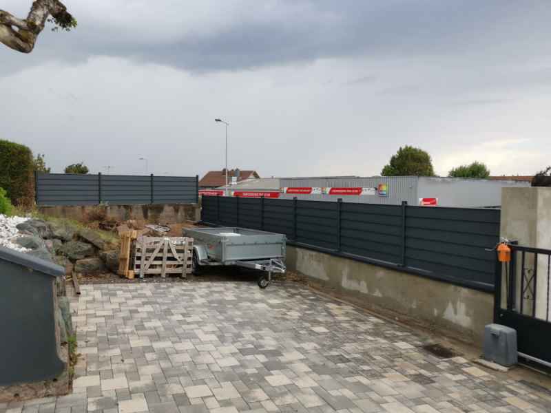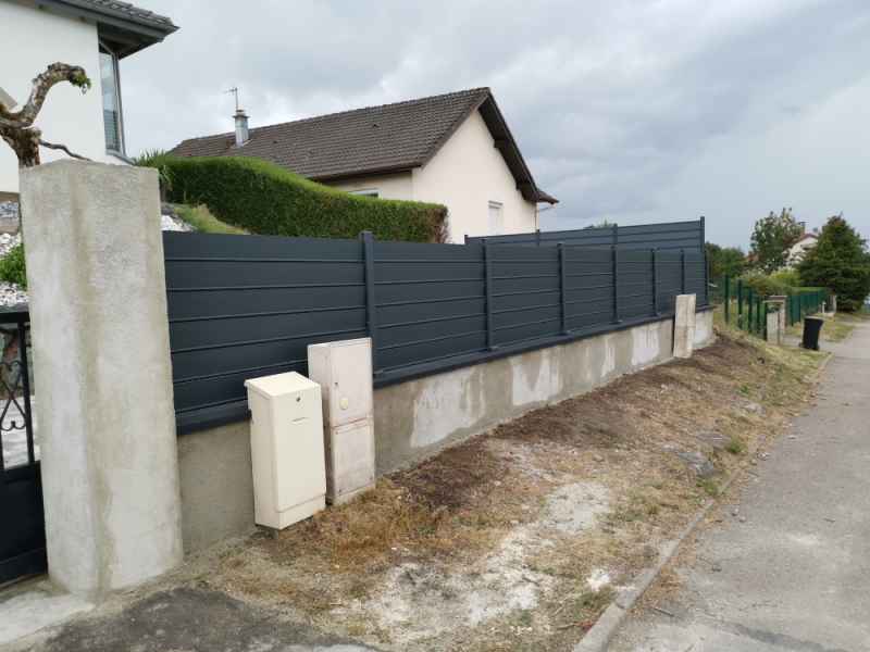 Reprise et modification d'une murette, crépis et pose de couvertines. Installation une clôture aluminium en lames ajourées.